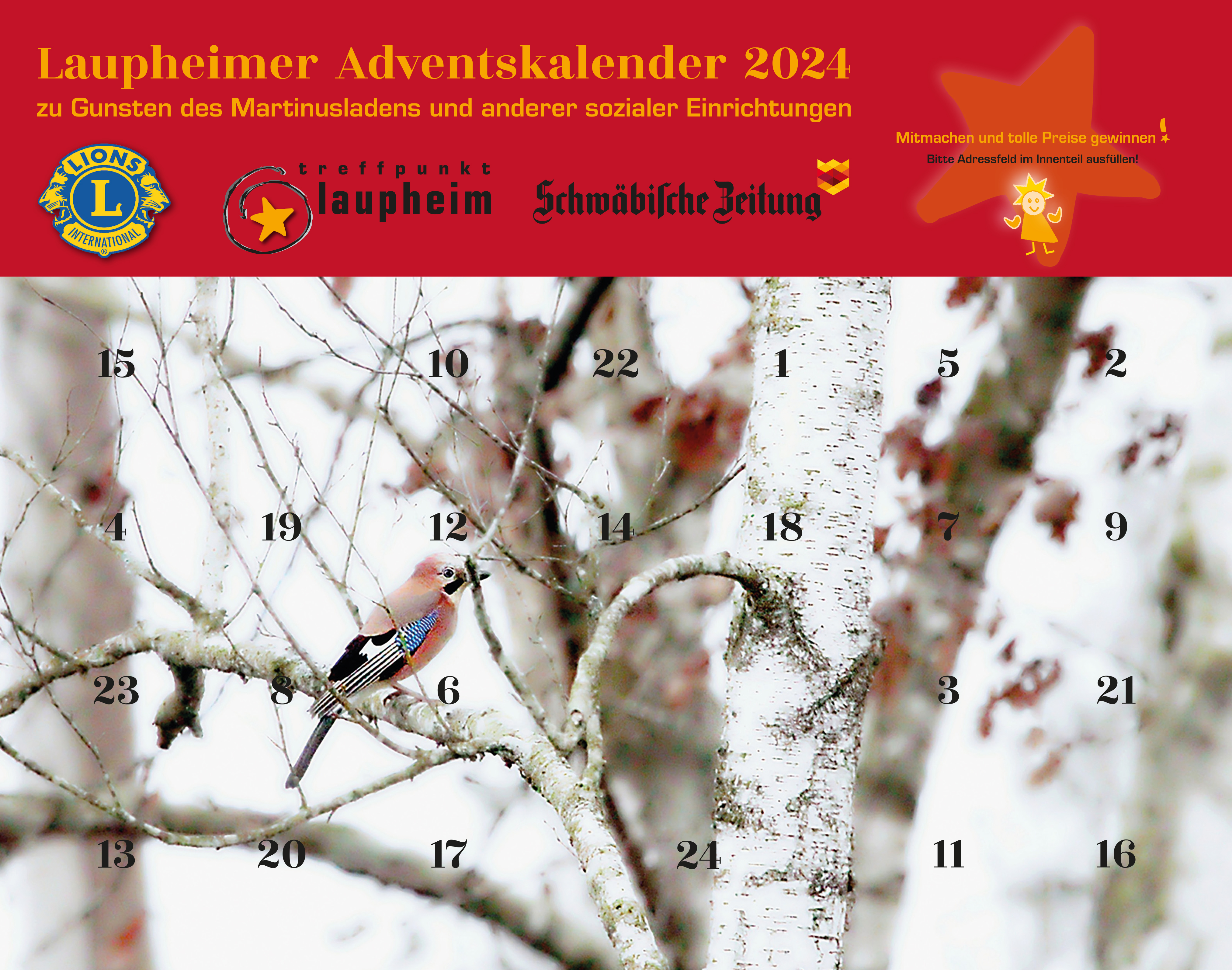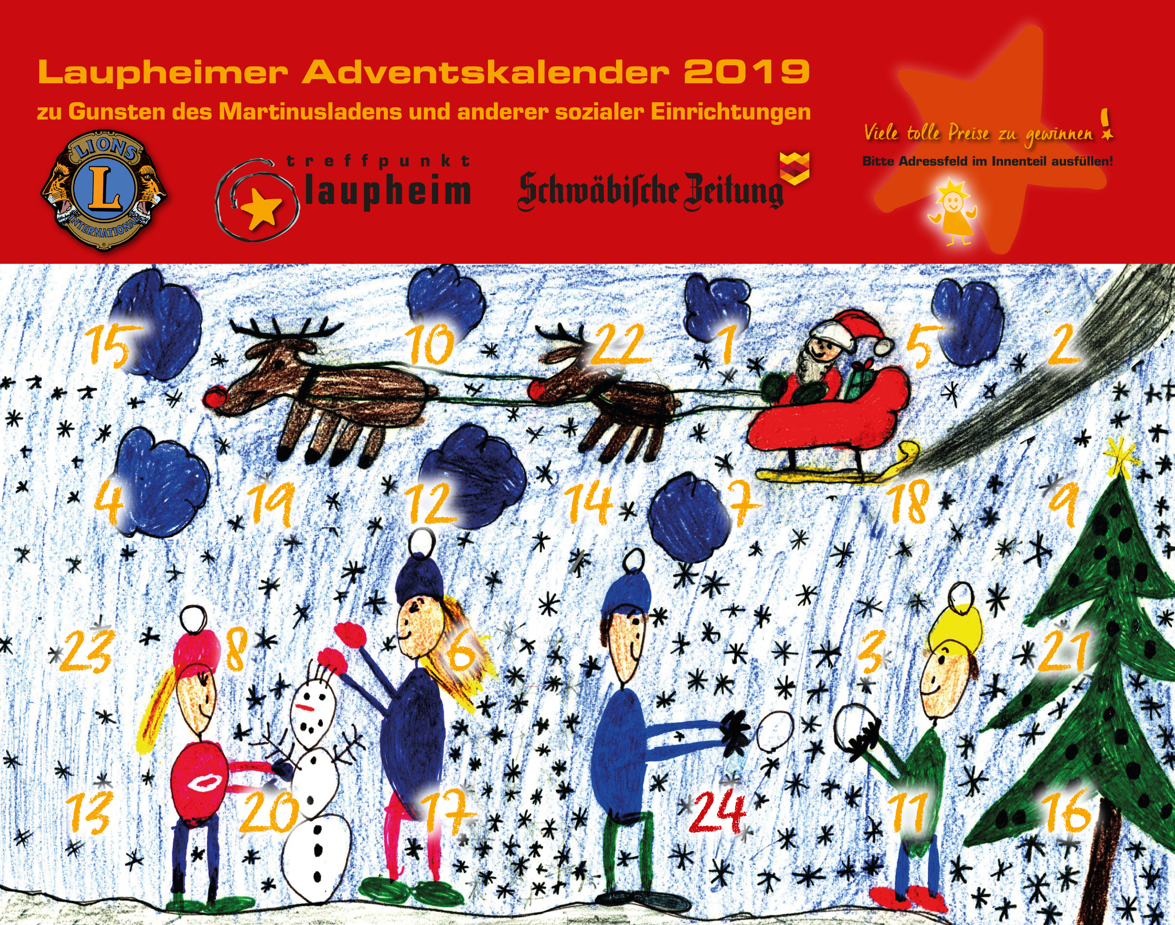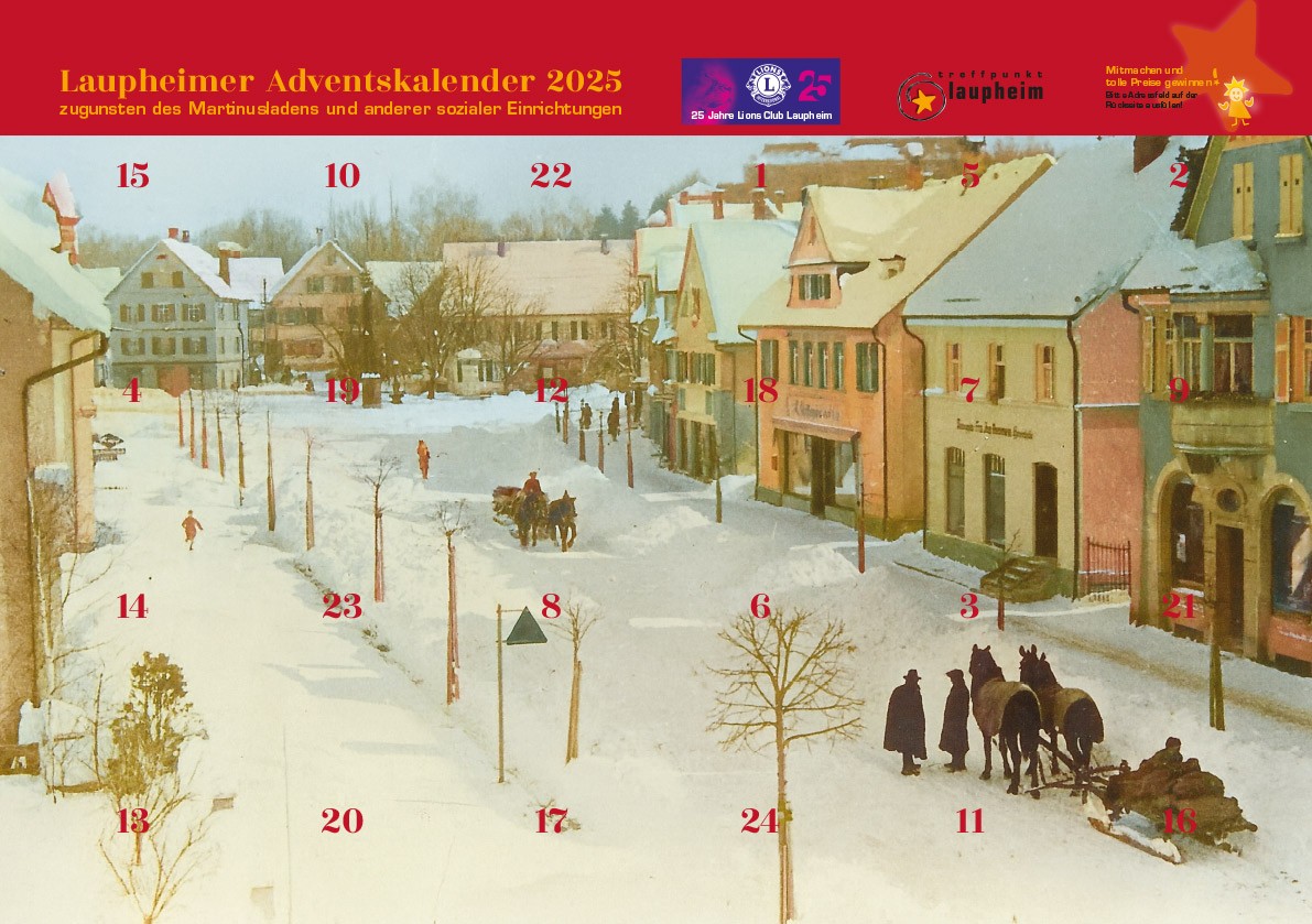 Jedes Jahr pünktlich zum Advent erstellt der Lions Club Laupheim in Zusammenarbeit mit dem Treffpunkt-Laupheim den Laupheimer Adventskalender. Er liegt in allen teilnehmenden Geschäften aus und kann dort erworben werden.
