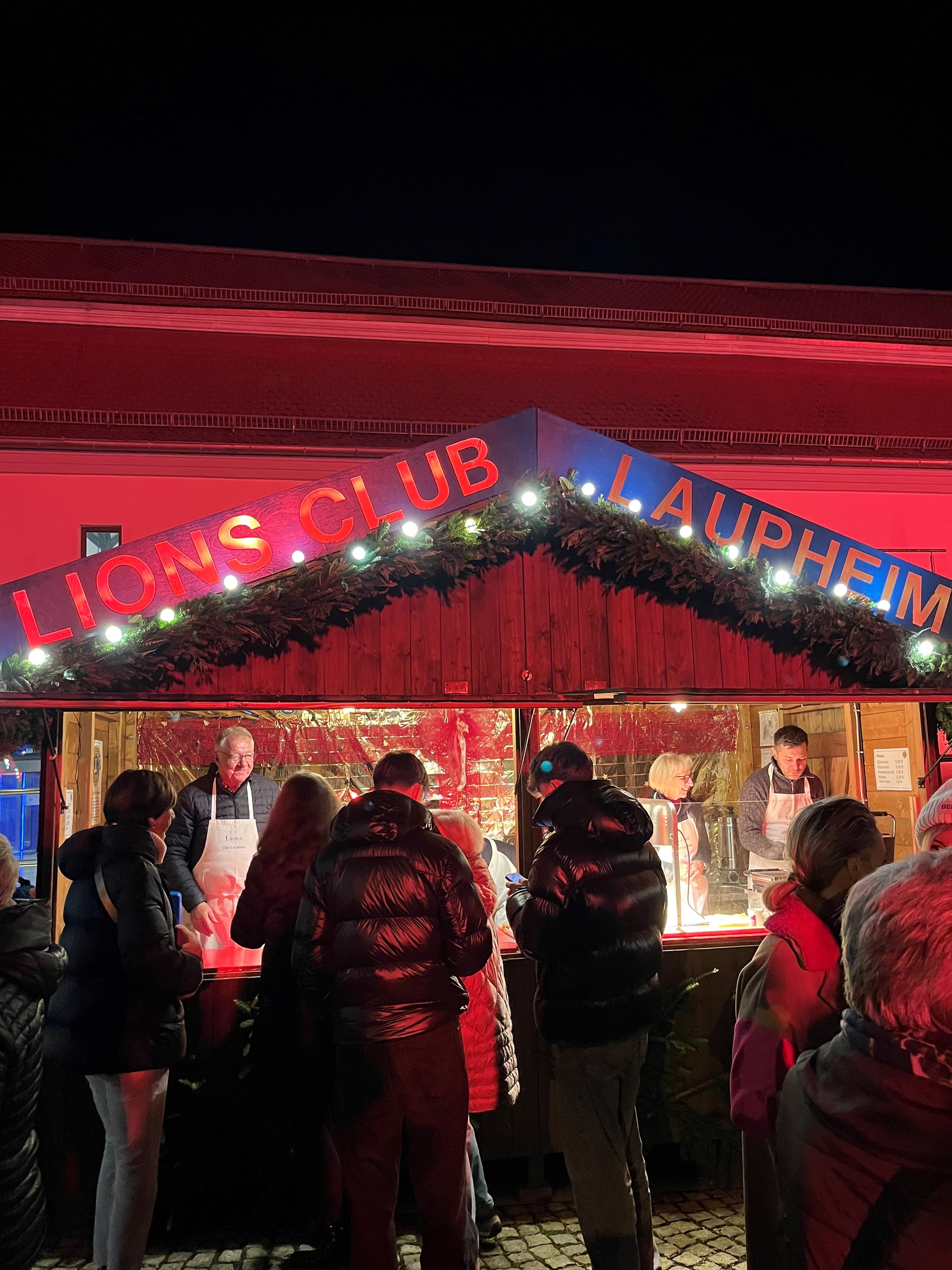 Auf dem Laupheimer Weihnachtsmarkt, der jedes Jahr vor der herrlichen stimmungsvollen Kulisse des Schlosses Groß Laupheim stattfindet, hat auch der Lions Club Laupheim einen festlich geschmückten Hüttenstand. Er öffnet traditionell am ersten Adventwochenende von Mittwoch bis Sonntag. Der Lions Club bietet dort in einer wunderbar weihnachtlich geschmückten Hütte Glühwein, Punsch und Glühmost an, an denen sich die Gäste wärmen können. Mit den wohlduftenden Waffeln, die vor Ort gebacken werden, lockt der Lions Stand zahlreiche Besucher an.